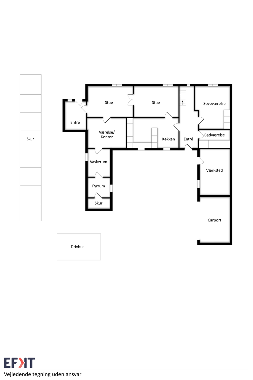 Indenfor mødes du af et rummeligt køkken med spiseplads og dejlig varme i gulvet, hvor morgenkaffen kan nydes i hyggelige omgivelser. Det store soveværelse giver rigelig plads til opbevaring og komfortabel indretning. Badeværelset er udstyret med moderne bekvemmeligheder som gulvvarme, hvilket sikrer en behagelig start på dagen selv i de kolde måneder. Entréen byder også på varme i gulvet samt en trappe, der fører op til første sal.